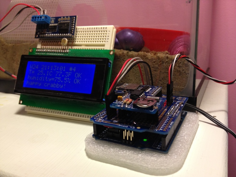 I wrote a simple program that takes a temperature and humidity reading, reads the current time, appends a line to a CSV file on the SD card, and updates the LCD display. Then it sleeps for a minute and does it all over again.